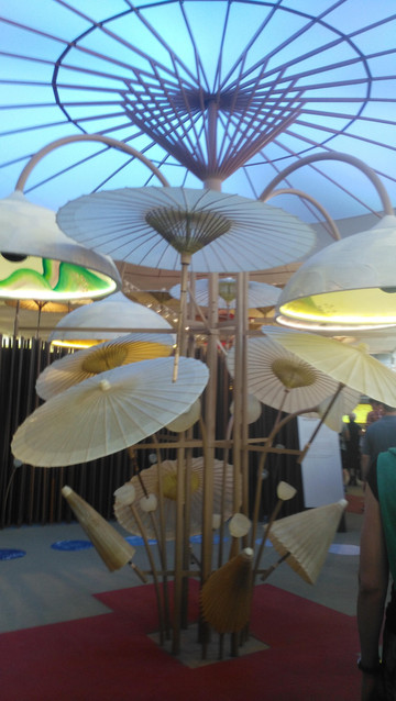 这是什么?油纸伞的森林?极富中国江南文化特色的油纸伞装点着展馆过道的两边和屋顶,使人如同置身于苏杭那悠长悠长的雨巷,再往前走说不准会遇上丁香姑娘呢。