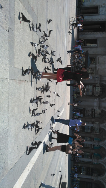 广场上有很多鸽子,一群一群的,很是温顺可爱,小孩和姑娘们都特别喜欢围着鸽子玩。但要小心了,那些在广场上转的黑人男青年主动上前塞玉米和彩绳圈到你手上然后向你讹钱哦,宰你10欧算少的了,最好不要理他们。