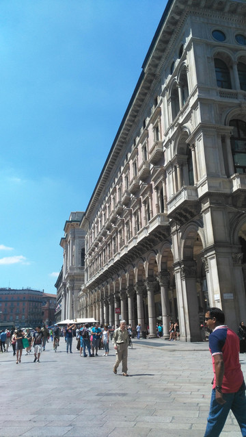 在米兰左侧(面朝教堂正面)有一条长廊,呈十字形,顶呈拱园形,顶上装有彩色玻璃棚。地面是用大理石铺成的马赛克图案。巨大的拱形建筑富丽堂皇,长廊内有装璜考究的金银首饰、时装、礼品店、餐馆,咖啡厅和书店。这里是米兰市民的休闲中心,到处是休息的市民及观光客,很是热闹。