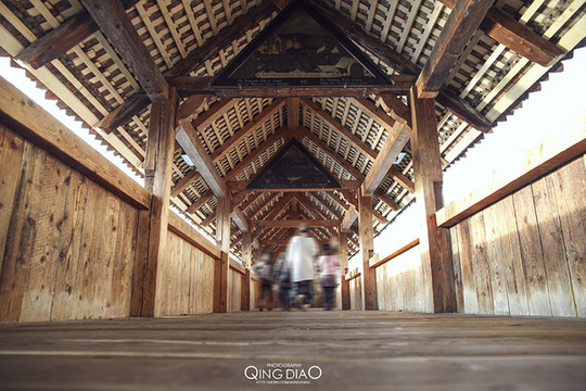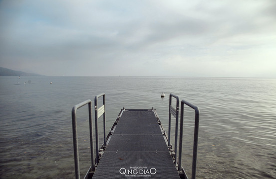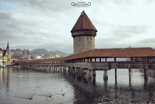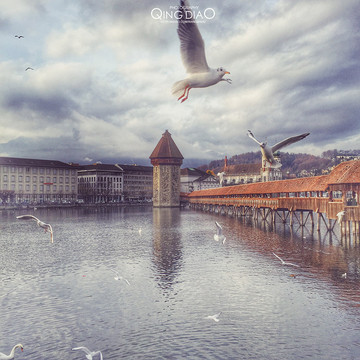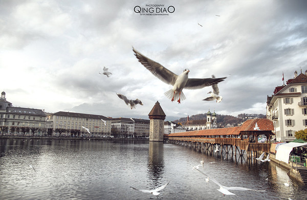 卢塞恩湖中间有个木质的桥,湖面有很多鸟在旁边,如果有人来喂食就会统统飞过来,完全不怕人的样子。