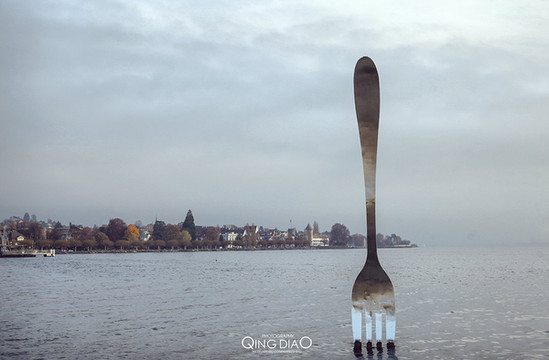 这个景点比较常见,一个勺子插在湖里,很特别有没有,如果是夏天这边会有很多情侣在这散步,并且旁边的岩石上有设计特别的椅子。