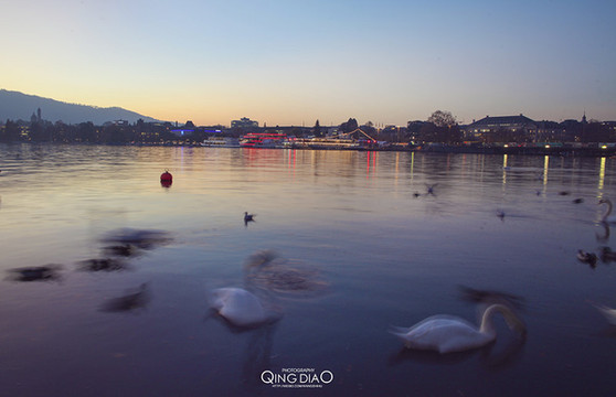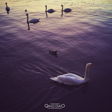 傍晚的湖面有很多天鹅在里面游荡,很美丽,配着多色晚霞,更加炫耀。