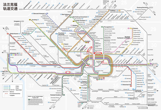 下面是法兰克福的地铁图,我有标机场和市区主要街道位置,总火车站附近都是。
