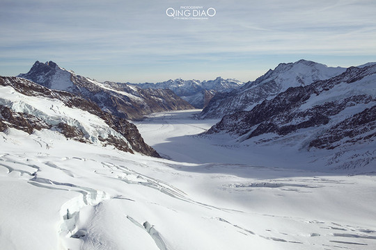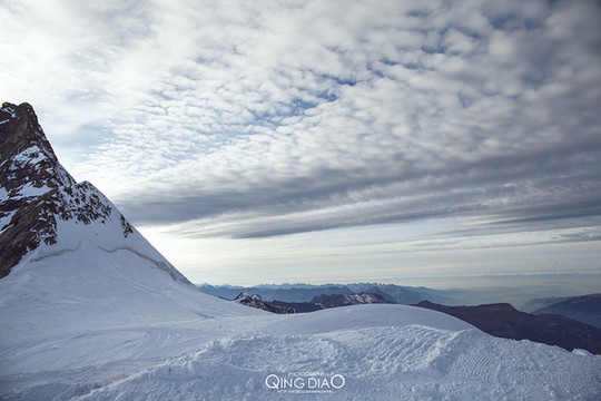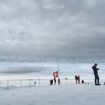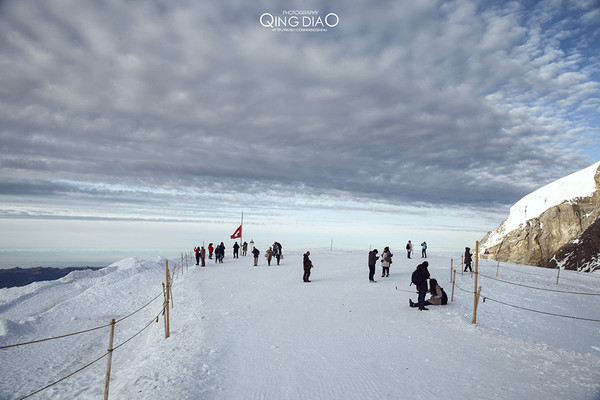 雪峰很壮观,天与雪地溶于一体,很多人在这与瑞士国旗合影,还有人打起来雪仗。