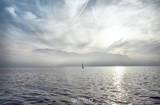 湖里有人在玩帆船,对面就是雪山,但雾太大,浓见度不高,可惜了。