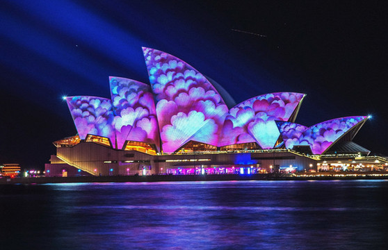 白色背景的歌剧院在灯光的照射下在夜晚显得更加璀璨夺目~~ 只是变化太快,小懿没拍好。。大家就将就看看吧~~ 非常建议每年5月底前往悉尼的小伙伴们去看灯光节,不仅是悉尼人比较大型的活动,也确实很有特色!每年灯光节的时间安排都不同,具体要以当年灯光节的时间为准哦~~