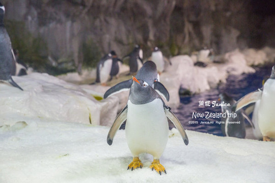 企鹅馆里有王企鹅与巴布亚企鹅等品种,王企鹅体积较大,仅次于帝企鹅,特征是颈侧有一明显的橘黄色斑块,胖扭扭的王企鹅,在冰雪上行走时,昂首挺胸、双翅在后,摇摇摆摆,逗趣极了,可是等它跳入水中游起泳来,那动作不是一般敏捷。