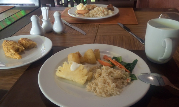 这家酒店早饭环境很好,正在我们房间下面,敞开式设计,四周无墙壁无遮挡。也有完全露天的地方供选择,不过早餐西式居多,毕竟西方人多。