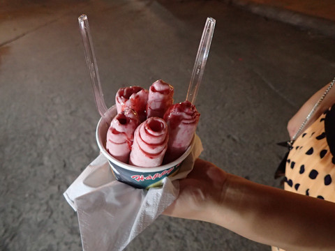 听说冰激凌很好吃,要了个草莓味的,现场炒起来的,剁了很多草莓进去。