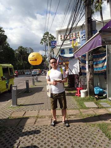 LG兴奋的拿着banana pancake回酒店啦,看到后面黄色气球标志了么,进去就是我们酒店啦。