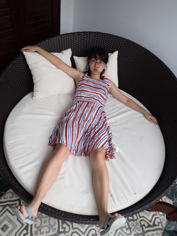 坐在位置上外拍,天气很热,旁边就是杂货店,游泳可以去买道具。