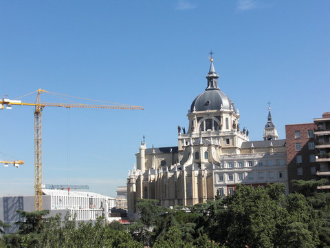 马德里皇宫规模宏大,宫前广场也很有气派,广场上建有气势同样不凡的皇家教堂。沿着皇宫边的道路往前走,可以看到不同形式的建筑,但没有看到商业建筑,显然都是政府行政部门所在地。穿过一座河上的小桥,在河边观赏皇宫的侧影,别有一番风味。