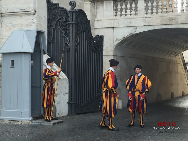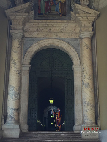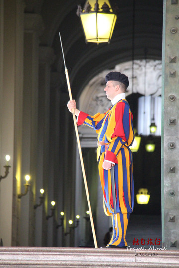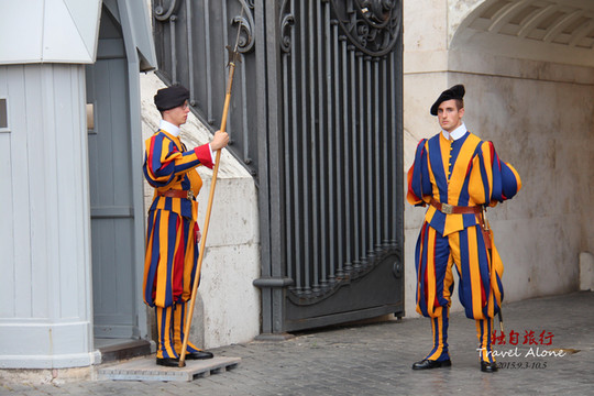 大教堂左边的大门有皇家卫队守卫,皇家卫队就是梵蒂冈国家的军队。卫士们个个高大魁梧,他们身穿红黄蓝三色条纹的古代骑士服装,手握长戟,威风凛凛。他们都是瑞士人,据说在16世纪初教皇受到了神圣罗马帝国的进攻,为了保卫教皇,100多个瑞士卫兵战死在教堂外,当时的教皇非常感动,于是决定世世代代雇佣瑞士卫兵保卫教堂。