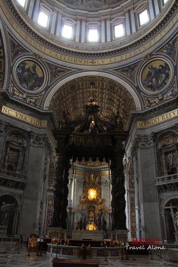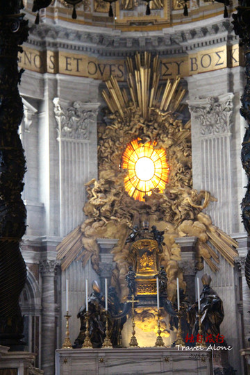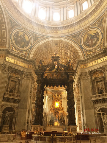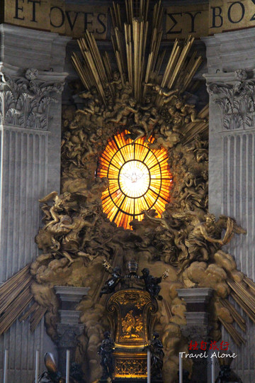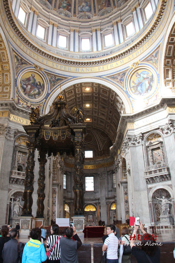 二是青铜华盖是贝尔尼尼的雕制的青铜华盖。它由4根螺旋形铜柱支撑,足有5层楼房高那么高。华盖前面的半圆形栏杆上永远点燃著99盏长明灯,而下方则是宗座祭坛和圣彼得的坟墓,只有教皇才可以在这座祭坛上,面对东升的旭日,当著朝圣者举行弥撒;