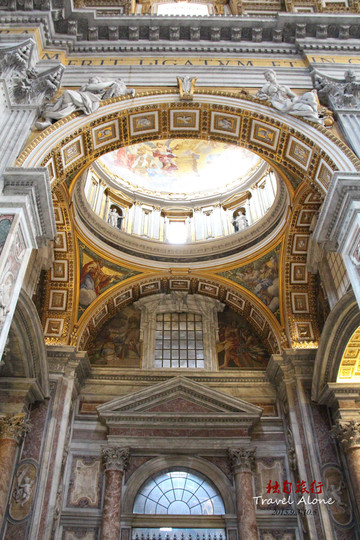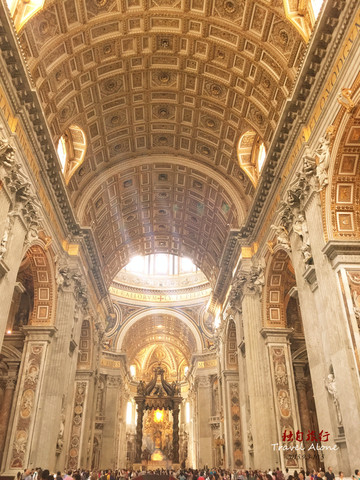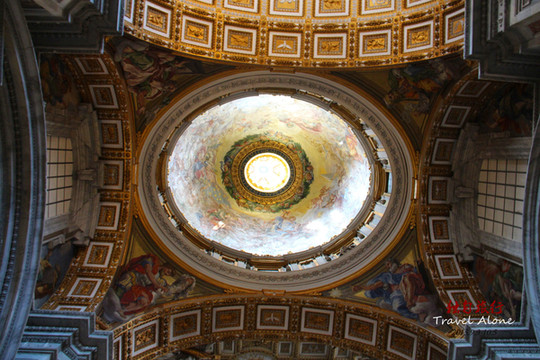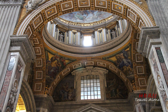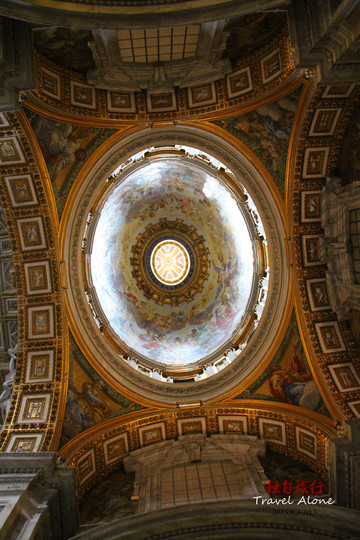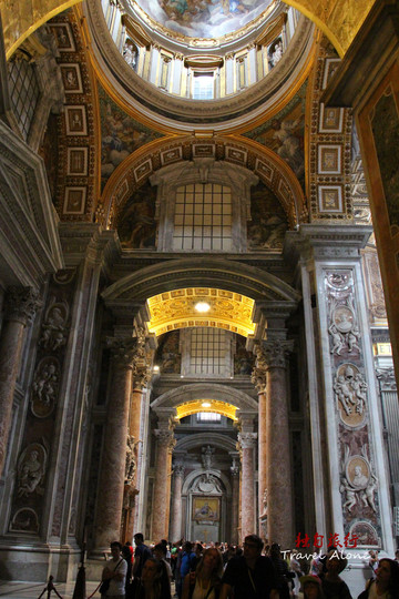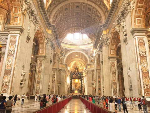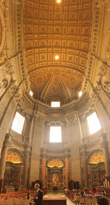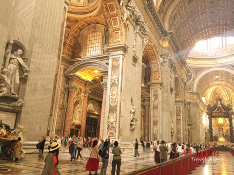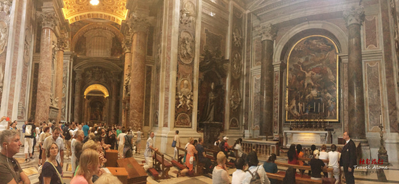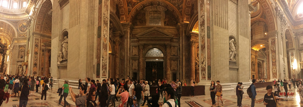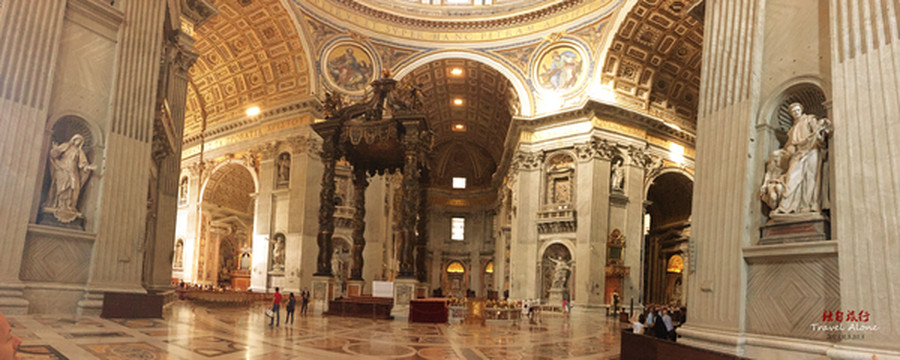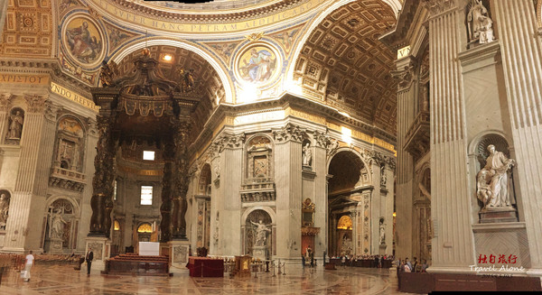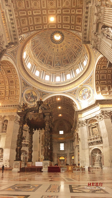 圣伯多禄大教堂是一座长方形的教堂,整栋建筑呈现出一个拉丁十字架的结构,造型是非常传统而神圣的,这同时也是目前全世界最大的一座教堂。教堂内部金碧辉煌,光线幽暗,神秘莫测,用大理石砌筑而成,里面的所有画像都是用不同颜色大理石拼接成图,工程十分浩大,不允许使用三脚架和闪光灯拍摄。