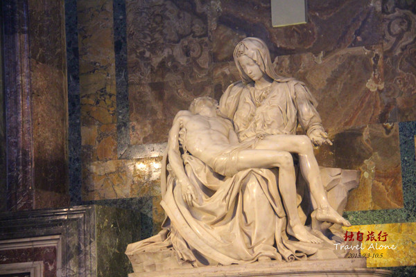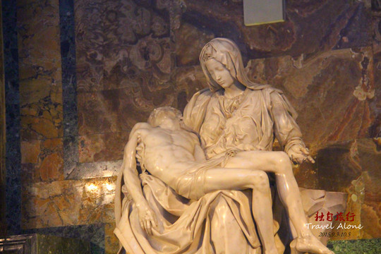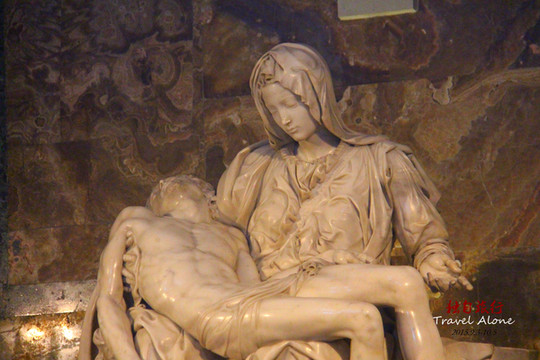 一是米开朗基罗24岁时雕塑作品《圣母哀痛》。圣母怀抱死去的儿子的悲痛感和对上帝意旨的顺从感在作品中刻画得淋漓尽手。这里所表现的圣母痛苦状与米开朗基罗以後的作品迥然不同;