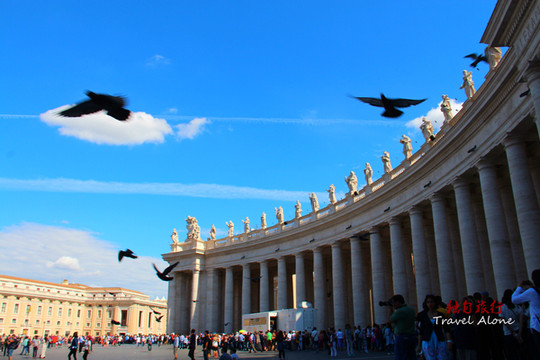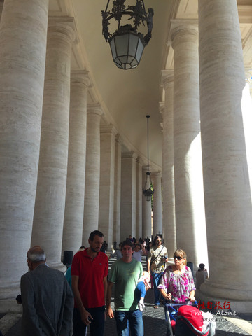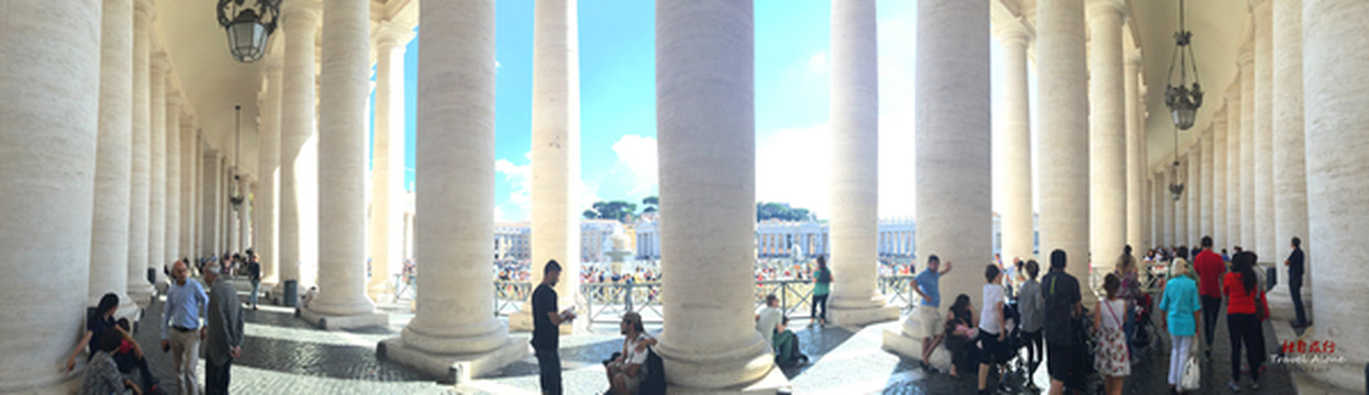 这两组柱廊为梵蒂冈的装饰性建筑,共由284根圆住和88根方柱组合成四排,形成三个走廊。这些石柱宛如4人一列的队伍排列在广场两边。柱高18米,需三四人方能合抱。