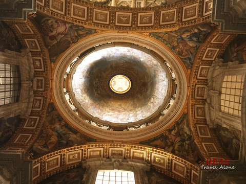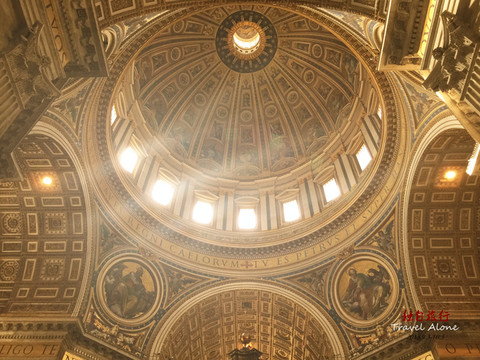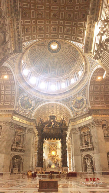 整个殿堂的内部呈十字架的形状,在十字架交叉点处是教堂的中心,中心点的地下是圣彼得的陵墓,地上是教皇的祭坛,祭坛上方是金碧辉煌的华盖,华盖的上方是教堂顶部的圆穹,其直径42米,离地面120米,圆穹的周围及整个殿堂的顶部布满美丽的图案和浮雕。一束阳光从圆穹照进殿堂,给肃穆、幽暗的教堂增添了一种神秘的色彩,那圆穹仿佛是通向天堂的大门。