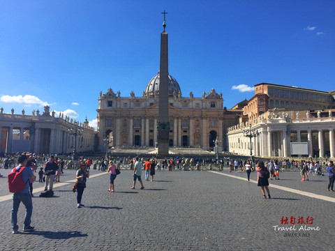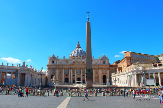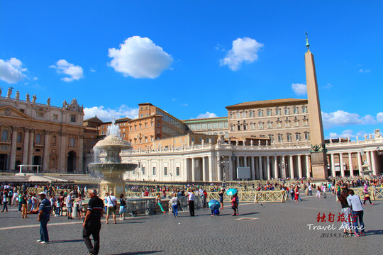教堂前面是能容纳30万人的圣彼得广场,广场长340米、宽240米,被两个半圆形的长廊环绕,每个长廊由284根高大的圆石柱支撑着长廊的顶,顶上有142个教会史上有名的圣男圣女的雕像,雕像人物神采各异、栩栩如生。广场中间耸立着一座41米高的埃及方尖碑,是1856年竖起的,它是由一整块石头雕刻而成的。方尖碑两旁各有一座美丽的喷泉,涓涓的清泉象征着上帝赋予教徒的生命之水。所有走进圣彼得广场的人无不为这宏大的场面而感慨。
