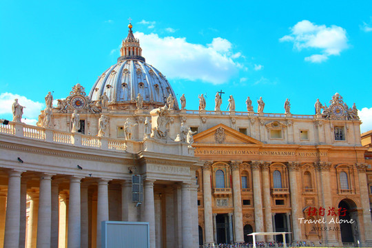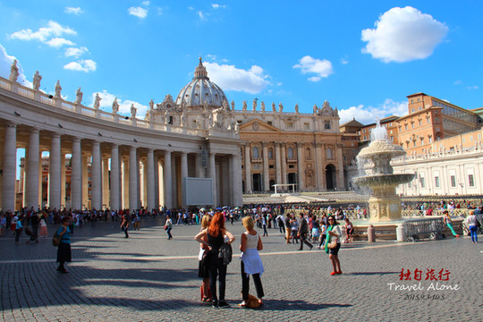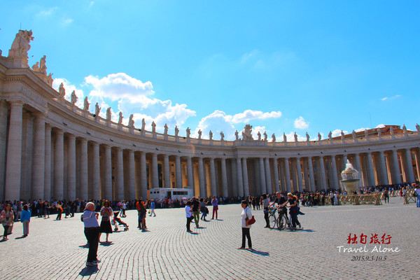 圣伯多禄大教堂正前的露天广场就是闻名世界的圣伯多禄广场,建于1667年,主持设计施工的是一位人,他的手笔赋予了广场上排成四行的284根托斯卡拉式柱子永恒的生命,柱子上方那美妙绝伦的圣者塑像四百年来一直诉说着当年这个才华横溢的建筑天才的名字:贝尔尼尼——巴洛克艺术之父。
