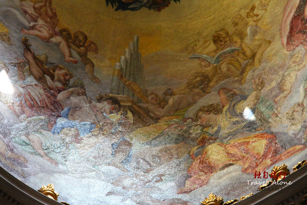走教堂内景 (24张) 进大教堂先经过一个走廊,走廊里带浅色花纹的白色大理石柱子上雕有精美的花纹,从左到右长长的走廊的拱顶上有很多人物雕像,整个黄褐色的顶面布满立体花纹和图案。
