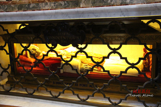 前面的第三礼拜堂CappelladelSacramento里有贝尼尼所建的祭坛,左侧以及与第二、第三礼拜堂相对的墙面上有波莱渥罗为伊诺欠兹奥八世建造的青铜纪念碑。