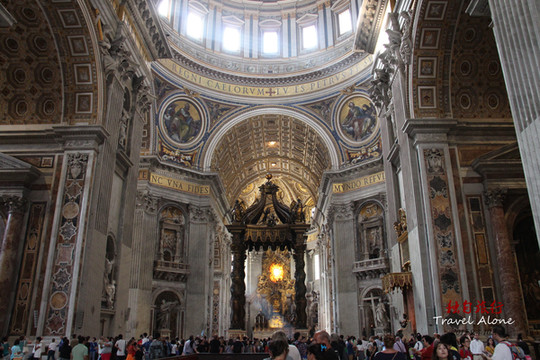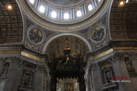 中央的圆顶是由米开朗基罗设计的,两重结构,内部很明亮。圆顶下是教皇的祭坛,用贝尼尼创作的青铜华盖覆盖着。那扭曲的粗圆柱似的独特形状很引人注目。下面的礼拜堂里有圣伯多禄墓。墓前跪着的是由新古典主义雕刻家卡诺巴作的教皇庀奥六世像。里面上部有彩色玻璃作的鸽子,下面装饰着贝尼尼作的巨大的“圣伯多禄的椅子”,面前的左边有珍宝馆的入口,那些豪华的圣器皿类显示着梵蒂冈的力量。