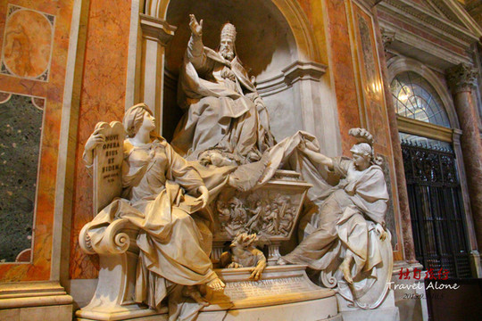 圣彼得大教堂门前左边树立着圣彼得高大的雕像,他神情自若、面带微笑,教堂外景 (18张) 右手握着两把耶稣送给他的通向天堂的金钥匙,左手拿着一卷耶稣给他的圣旨。他头上的缕缕卷发、脸上的根根皱纹、下巴上的撮撮胡须和身上的层层长袍无一不被雕琢得细腻、逼真。如果把脸和头发涂上真实的颜色,一定会被当作真人。