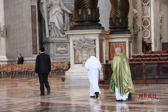 原来,基督教总舵马上要开始一场弥撒,保安人员将人们挡在大主殿之外,只有正宗的基督教徒才可以入内做弥撒,那么什么样的人才是正宗基督教徒呢!我告诉你,你只要对保安说一句我是弥撒,就可以被放行入内了!是的,口说无凭那是中国特色,在欧洲人们就是可以诚信到凭你的一句话就相信你。何况这里是什么地方,这里是对心的地方,谁会在这里撒谎呢!除非是没有信仰的人,所以,是的,我撒谎了!开始我看到不断有人说一句我是弥撒就往里进,当时我还没弄明白什么意思,我以为是自我介绍呢,我就说,我是一个中国人。结果那个保安看了我一眼说,NO!哎!于是我又呆了一会儿,当一位女士说我是弥撒时,我赶紧接着用英语说,我也是(密吐)。这时保安对我说,弥撒会持续一个小时,你不能中途退出,我连忙说OK!就此,我进入总殿,在全世界基督教总舵参观了一场盛大的祈祷。