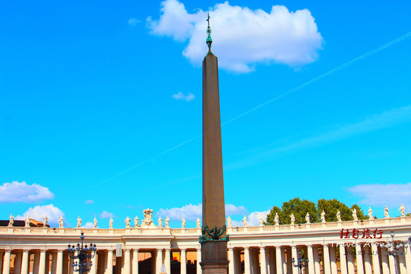 广场中央,矗立着一座方尖石碑;铜狮之间镶嵌着雄鹰,作展翅欲飞状。这座石碑原是罗马皇帝卡利古拉为装饰皇宫旁边的圆形广场,远从埃及运来。1586年,教皇西斯廷五世下令将石碑移至圣彼得广场。据说为此曾动员900多名工人、150匹骏马和47台起重装置,花了近5个月时间,才完成这项搬迁工程圣彼得广场全景。
