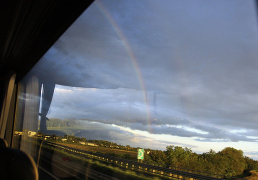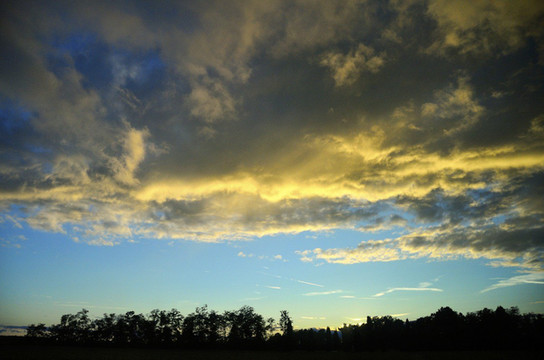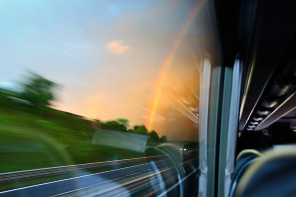 坐上大巴,右边是一条硕壮圆润的彩虹,拔地而起,在天穹甩了个漂亮的弧,又回落到地上。这条彩虹伴着我们,走了很久。左边,原本是乌云一片,但终于抵挡不住强势的夕阳,于是,整个天空像燃烧了一样,连地上的树也上上下下染遍金黄。
