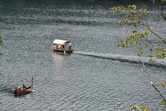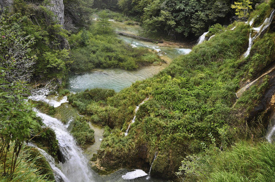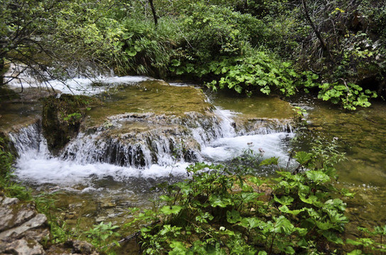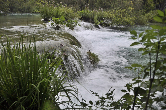 雨真大。最大时蒙住了眼,目之所及一片朦胧,只听那哗哗地雨声,在周围盘旋。我们沿湖行走,随湖上山。有时湖水汹涌就在身边,有时静谧地在远处等着我们。豪雨过后,但见两岸断壁悬崖,林木茂盛,山毛榉树、杉树和忽布榆郁郁葱葱,宛如一幅山泉流绿图。那树的色彩,已经开始微微变化,马上,它们便就绽放秋的美丽,但我们等不到那时,有遗憾。湖中碧波粼粼,湖与湖之间由木桥蜿蜒相连,还有高低错落、形状各异的天然堤坝将湖水辟成多股湍流。坝身多洞穴,蕴含有形形色色、千姿百态的石笋和钟乳石。我们在洞穴里钻进钻出,累而欣喜。游客在九寨沟,或许可观赏到如十六里湖的景色,但绝没十六里湖的自由。瀑布则仗雨而更气势不凡,随处可见白如银练的瀑布,成梯形一节节飞流而下,有的几乎流至脚下,触手可得。