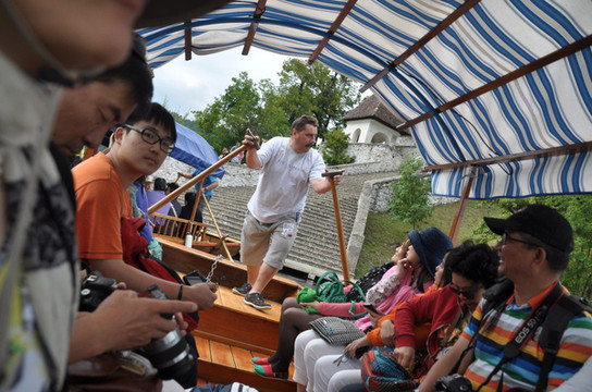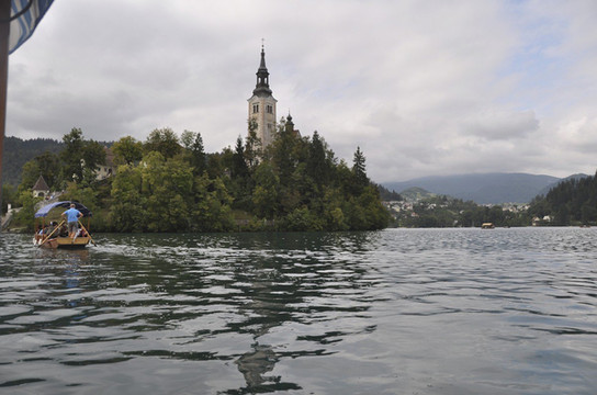 下午,游布来德湖。布莱德湖从地理位置看,位于阿尔卑斯山南麓,从地质学角度看,它是由冰川融化后形成的湖泊,山顶积雪融水、山间清泉不断注入湖中,故有“冰湖”之美誉。从俺等俗民初浅的审美看,湖水清澈见底,周围漫山遍野绿树成荫、绿草如茵,阿尔卑斯雪峰在太阳的映照下显得清晰可见,一切都美得像一幅风景名画。画中不时有几只天鹅、野鸭和其他水禽游过,撩起一波波涟漪,在湖面荡漾。湖水没有任何污染。让人啧啧称奇的是,卢布尔雅的船夫,硬是用自己的双手,划浆把我们一船十几个人,送到湖心的小岛。