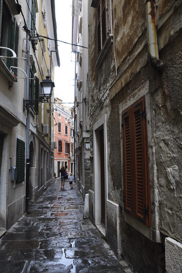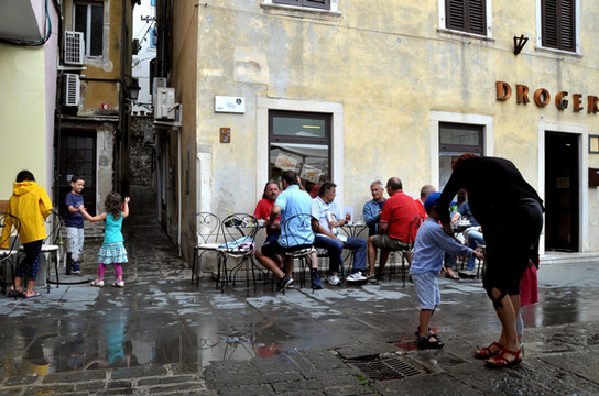 我们这个团,一定有人人品不好。——可能就是我。地中海皮兰这一段,据说最美,天也常晴好,真正是海天一色,湛蓝一片。可是我们在皮兰,雨接雨,地中海像黃浦江一样灰暗,只在近处能见到它其实清彻见底。不得已只能避开大海进小巷,在狭窄的石阶和斑驳的石墙中体验千年沧桑。我们这个团,可能有人人品很好。一定不是我,否则,我怎么只能从人缝中观赏那难得的七彩之虹?