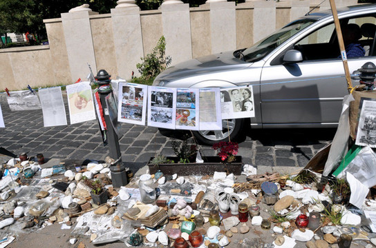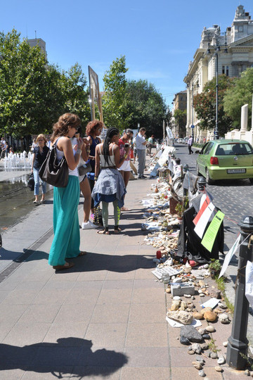 走完景点,自由活动。尽量多走,往深里走,走到一个像是街心花园的地方。那里陈列着许多纸质的资料、相片、水杯、皮鞋等等,可能是二战时期烈士或平民们留下的遗物。不间断地有人神情凝重地参观,拍照。匈牙利诗人贝多斐诗云:生命诚可贵,爱情价更高;若为自由故,两者皆可抛。