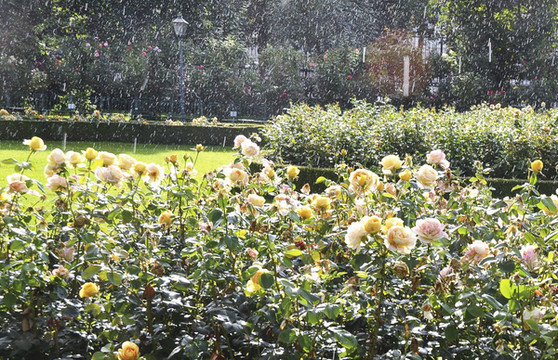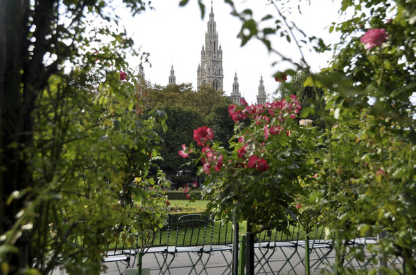 而我对维纳纳的最深最美印象是——太阳雨。真正的东边太阳西边雨,看着豆大的雨点在夕阳的映照下闪着晶莹的光。落在虽夏末仍艳丽的玫瑰上,美过任何一颗施瓦洛斯奇。雨点大而密,我在雨中走,花在一旁静静绽放。不敢取出相机,专心享受大自然的恩赐。走过花丛,走出公园,便了无雨迹,蓝天白云。