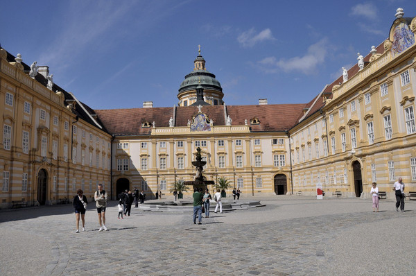眼前、流过小镇的瓦豪河谷,是整个多瑙河流域最美的一段,始建于1089年修道院,高居山顶,傍河而立。整个建筑群是巴洛克风格,庄严,伟岸,摄人心魄。小处则随时可见壁画雕塑,细腻精致。走廊里有些窗帘是五线谱图案,阳光斜斜透时,让人从视觉感受音乐的旋律之美。修道院里有一间世上最漂亮的图书馆,是唯一一间得到世界文化遗产名号的图书馆。院图书馆藏书九万余册,还有无数珍贵的中世纪手稿。由于其名望和学术价值,在1780年到1790年约瑟夫二世大量解散奥地利的修道院时,梅尔克修道院得以幸免,并且逃过了拿破仑战争的破坏。1938年德奥合并,学校和修道院的大部分被纳粹收归国有。