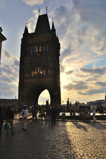到达查理大桥时,正是傍晚时分,夕阳无限美,并且,将在一段时间内越来越美。好心的导游给了我自由,让我半个小时之后在桥对面的广场和大部队汇合。桥上桥下到处溜达,看游人如织,看市民休闲;看马戏演员激情,看画家静谧……。很满足。就是爱自由,就是不爱走寻常路。走到桥对面,太阳正往对面的群山楼宇落下,一些专业摄者长枪短炮地架好装备,等待最美瞬间的来临。看到我和我的相机,他们主动让出最好的位置让我拍摄。更满足。要知道,那是黄昏时分 ,是在素有金色布拉格盛名的布拉格,是在标志性的查理大桥上!