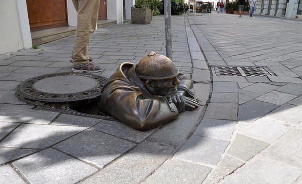 早晨出发,一不留神,就从奥地利到了斯洛伐克首都布拉迪斯拉。行前,尚不知道有一个叫做布拉迪斯拉发的城市。网上搜了搜,所谓真人不露相——欧洲的任何一个小地方都不可小覤——布拉迪斯拉历史悠久,古代曾为罗马帝国要塞。现在,是斯洛伐克最大的内河港口和政治、经济、文化中心及石油化工业中心,由新、老两个城区组成。我们有半天的时间,在旧城区逛,看诸多班驳的名胜古迹,看典型而精致的欧洲近代建筑的气势如虹。行程上有大广场、主教宫、斯洛伐克、哥特式圣马丁大教堂、布拉迪斯拉发城堡等,回来发现照片丢了,记忆便也丢了。印象中的布拉迪斯拉之行,就是在各种建筑之间行走,有的能进,有的不能进,时而上山,时而迷路。记忆最深的是趴在阴穽里冲着路人戆笑的工人雕像,和摆在街道休息区里的乒乓台。在那儿打乒乓,捡一个球得奔多少路啊。斯洛伐克人的脑洞大到不拘小节。