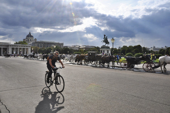 维也纳,奥地利首都,毋庸赘语。且只两个来小时,买一两个施瓦洛斯奇,时间还是宽裕的,要想看看街景啥的,连盲人摸大象的资格都没有。随便走走,看马车“哒哒”经过,马车夫奇装异服,古人打扮,仿佛可以把游客从今生带到前世。很想坐上去游走一番,可是不知道要多长时间,不敢轻举妄动。城门前招揽生意的小贩也非同一般,礼帽、假发、极瘦腰身的燕尾服,好像直接从宫廷走出。那些建筑,不高,一字排开的建筑,即使在今天,依然只能用震撼两字来形容,在中世纪散发的光芒可想而知。
