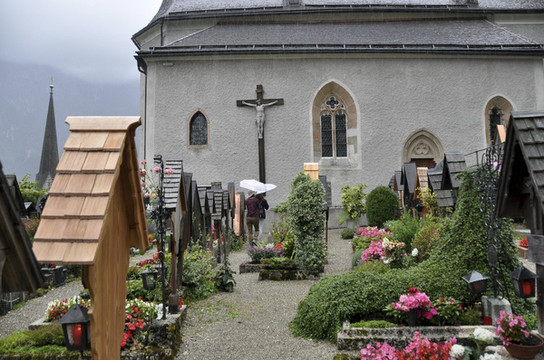 在暴雨蛮横地阻止游客脚步的时候,我从大教堂就近去了小教堂。我忘记了它的名,但其实它很有名,世界上独一无二,因为那里陈列着N多的骨骼。教堂很小,走过很容易错过。但是要买票,在不以景点为牟利的奥地利,足见它的重要。入内不用挪步,原地转个圈,一切尽收眼底。最多的是头颅骨,整整齐齐地迭着,有些上面还标有主人的姓名、职业和死亡日期,有的则画有精致的图案。胫骨腓骨之类则像柴禾一样垒着堆在一边。哈尔斯达特人以自己的方式表达对死者的怀念和尊重。几千年来,哈尔斯达特的生者死者始终生活在自己世外桃园般的家园里。日积月累,墓地狭小,所以每过十年,尸骨就要被挖出放进罐中,为新的死者腾出地方。罐中的尸骨就被移入教堂。真是一种怪异而独特的风俗和传承。
