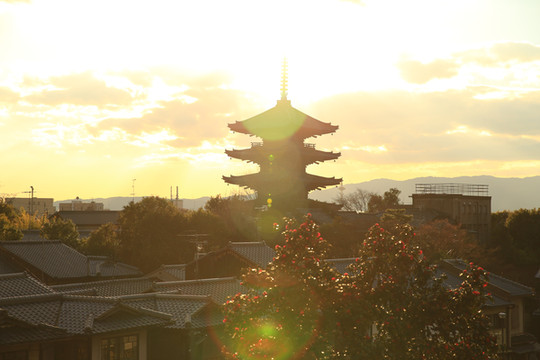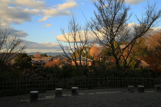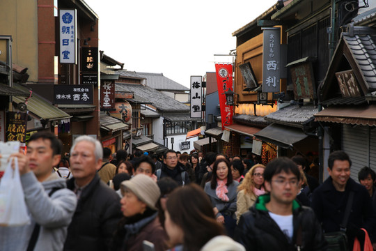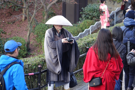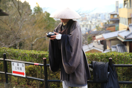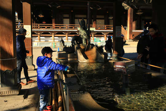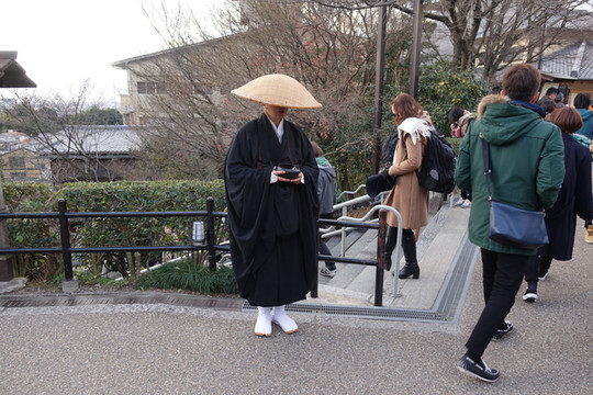前来清水寺来朝拜的人很多,而前后左右又有很多喝茶歇脚的茶社,每位500日元。沿路有很多和尚,低头念叨着,这照片里的老人家都没有牙齿了,我从进寺就看到他现在这里,一小时后出来他还是现在这里我心里有种说不出来的滋味。往北一直走是二年坂和三年坂,都是很古老的日式房屋,售卖一些礼品或者改成具有特色的餐厅什么的。再一直走下去往东一点就是高台寺,这是丰臣秀吉病逝后他的夫人为祈求他冥福而修建,后来德川家康一统日本为了稳定丰臣秀吉旧将,把这里修建更加壮阔并保留至今,我们到这里的时候已经4点多,太阳西落,近黄昏十分再看看这里,突然让我想到了多年前也是在黄昏十分去的清东陵,那些骁勇的战士,那些丰功伟绩的将军,那些一统天下的枭雄们,能留给后人们多少,我们在世上一遭又做了什么,奉献了什么?风吹得竹叶婆娑,日本的天黑的很早4点多已经不见了太阳,我们坐在石阶上望着远方,静静的听风的声音,只是你想真的静五分钟以上是不太可能的,壮壮在一旁抓石头,踢石子然后过来跟我说,我又饿了,天啊这个儿子太能吃了,中午就吃了一个巨无霸了啊!好吧,也该走了,晚上要回到大阪去,这是最后一次换酒店,今天住到大阪,明天再去奈良,距离2016年还有24个小时!