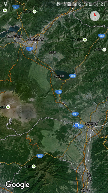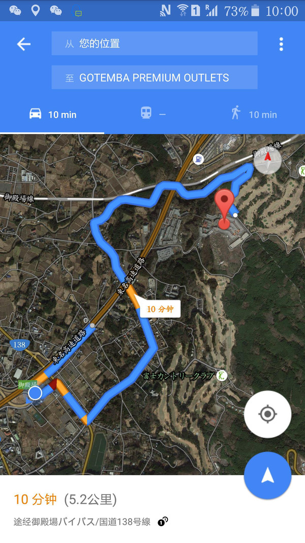看到左边露出来一点点富士山了么,这是从御殿场出来往河口湖走的时候,我已经不知道东南西北了,用卫星定位看看大概方向和时间。