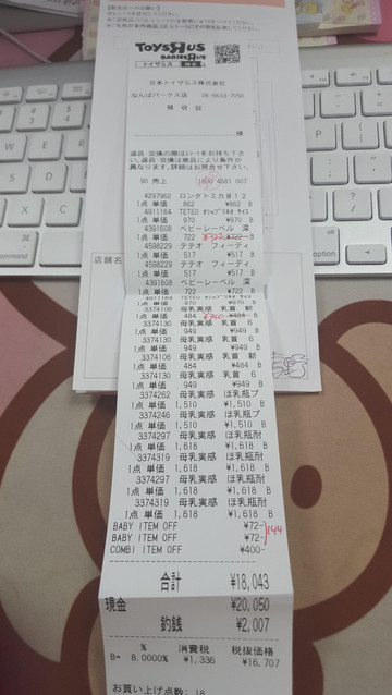 这个是大阪最后31日晚上关门前冲进去赶紧买的,因为出门前答应即将生产的亲戚买奶瓶,奶嘴什么的,所以在短短时间内冲进去采购,然后去另外一层的退税柜台办理退税(上图为没退税之前的单子,最后总计退了1200多日元吧)