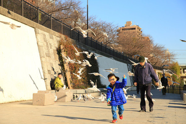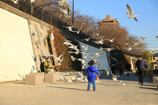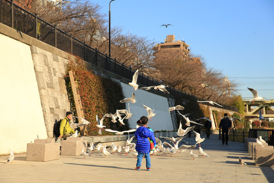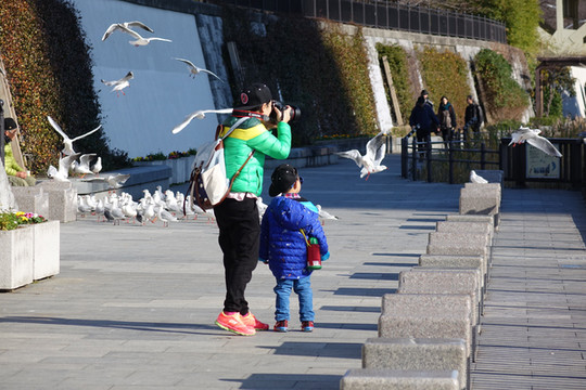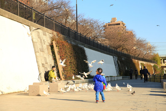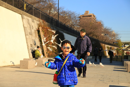 有个日本人在喂鸽子,鸽子飞来飞去很美,壮壮驻足观看,开始还有点害怕慢慢蹭过去,后来就扑向鸽子让它们飞起来,不过几次以后他就走开了,别让老人家生气啊。