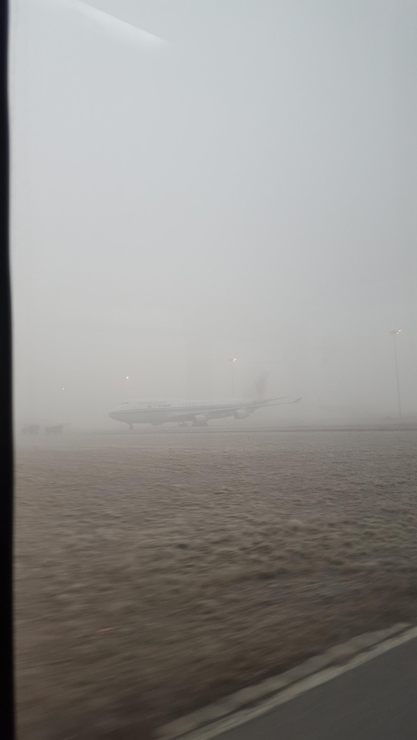 这个是在一片大雾中,我们乘坐摆渡车到处找飞机,呵呵,晚点1个多小时已经很幸运了,听朋友说,一般飞机已经都晚点8小时了。