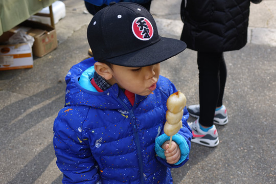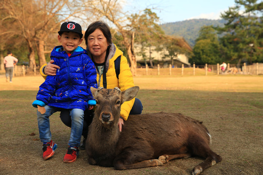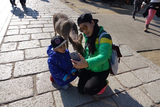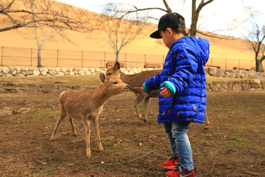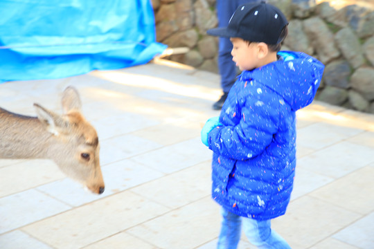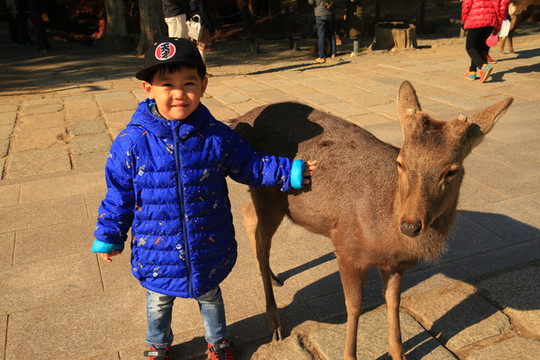 路边有当地美食烤团子,壮边吃边说,好甜啊,吃着吃着来了条馋嘴的小鹿上来就跟壮抢团子,吓得壮转身就往我怀里跑,我当时就在他身后,壮一转身鼻梁子磕到了我的相机机身上,这时候小鹿上来就舔壮嘴边的甜酱,吓得壮一下哇啦啦啦大哭起来,路边的人都纷纷大笑,好像还有人拍照片了,晕,能把照片给我多好,哈哈哈哈。