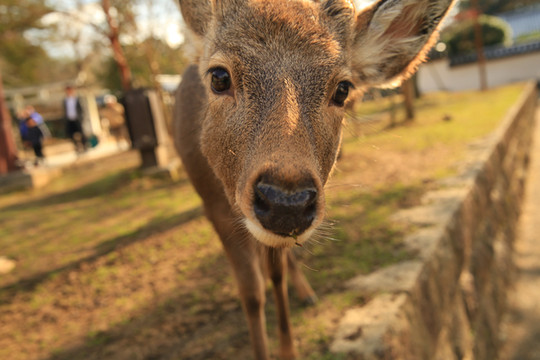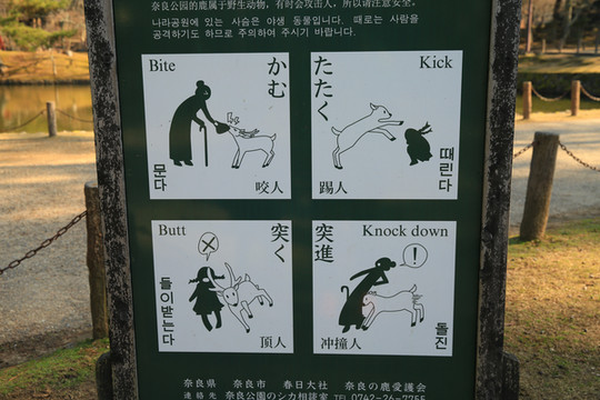 这个公园占奈良面积的一半,在奈良东部,很舒服,很巨大跟原始,太适合慢慢走慢慢逛了,园里养了近2000条鹿,据说信佛的日本人认为鹿是神的化身,因此就把鹿养在这里,时间久了它们也不怕人,旁边还有鹿饼干卖,有的鹿经验老道,会到你衣服兜里去翻饼干,呵呵。看看这个指示牌,说明你不要招惹它们,它们也是有脾气滴!