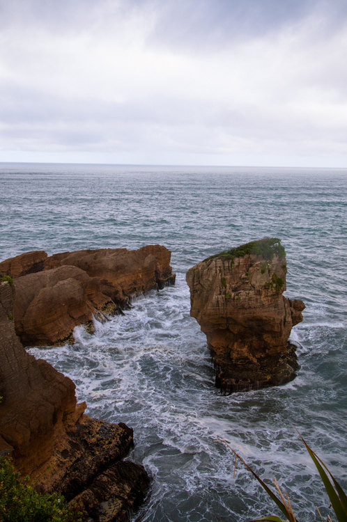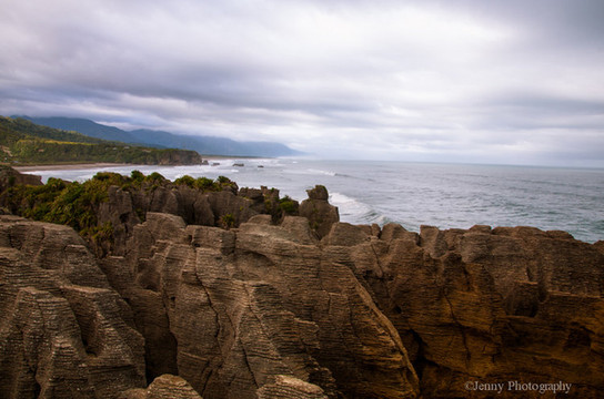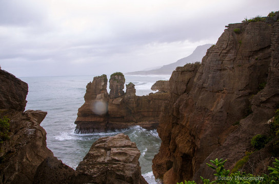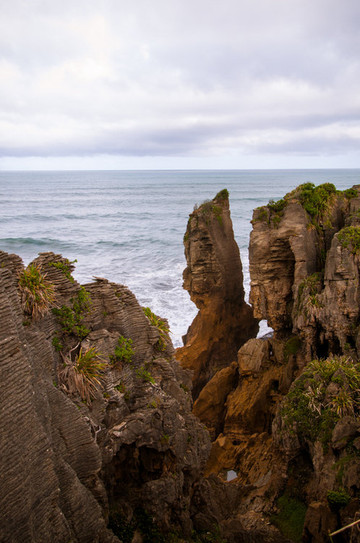 薄饼岩(Pancake Rocks),又称,形成于3千万年前。成千上万年以来,小型海洋生物和沙土间交替层压并埋于海底,产生了硬石灰石和软砂岩堆积而成的多层区域。地震活动让海底水平线上升并最后干枯。而那些慢动作的艺术家——雨和风,开始侵蚀软砂岩。最后数以百计的地层沿着悬崖沟壑垂直形成,如同巨大的层层薄饼。在许多悬崖内部,有许多由于雨水潮湿形成的垂直通风道和一些因为海水冲击形成的水平隧道。如今,在涨潮时分海水通过大量垂直的喷水孔冲出。如此而来,这里会不时出现喷泉状隆隆作响的水柱。