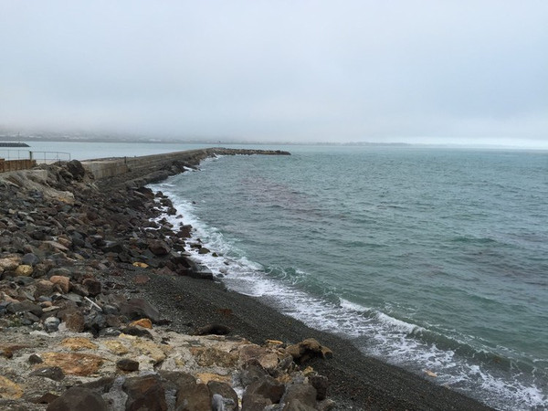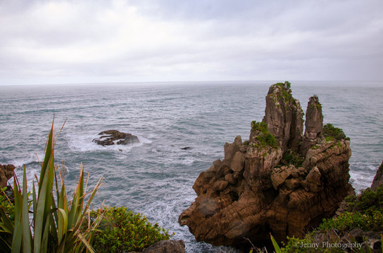 一路沿海行驶,天气时阴时雨,风也不小,层层波浪涌向海边,远处能看到怪石林立,景象奇特,这怪石就是我们一会要去游览的薄饼岩。